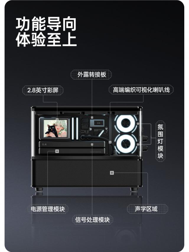 花再 NEW CYBER 整体采用上下分区设计,下方为声学区域,上方的三面透明装饰区域除拟物风扇氛围灯外还容纳了电源管理模块、信号处理器模块、外露转接板和一块 2.8 英寸彩色显示屏。