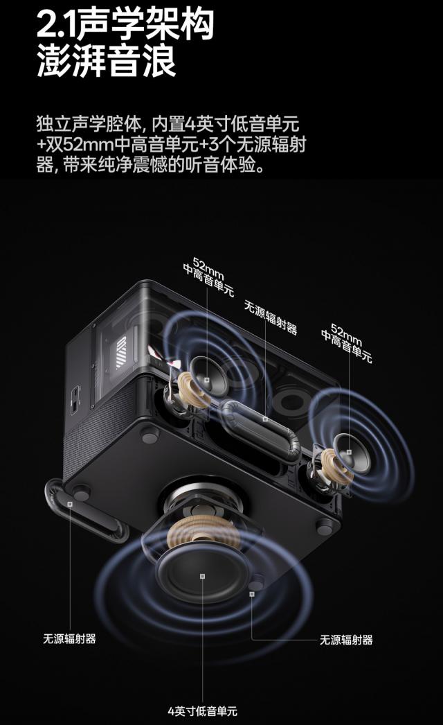 其音频部分搭载全 DSP 数字处理系统,配备双路 D 类数字功放,采用 2.1 声道声学结构,内置 1 个 4 英寸低音单元、2 个 52mm 中高音单元、3 个无源辐射器。