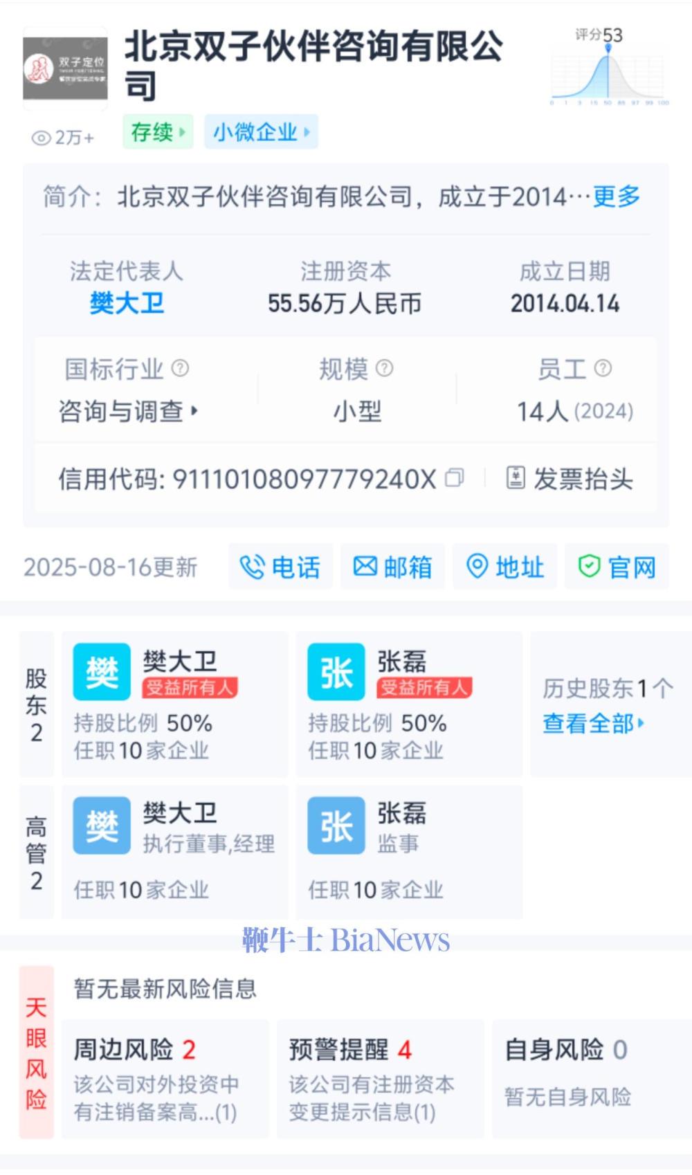 其中,樊大卫为该公司法定代表人、双子定位执行董事,持股比例为50%。